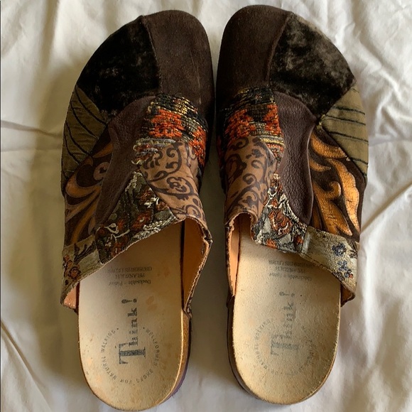 Brown leather, suede and fabric clogs~so cute and great to wear around the house during the pandemic