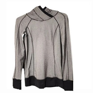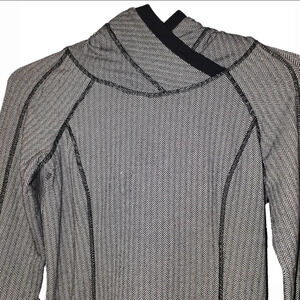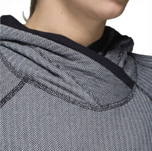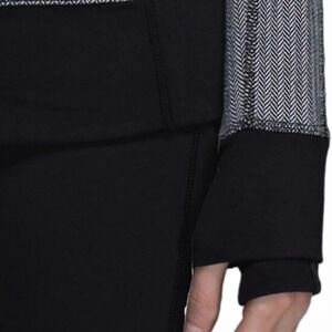This is a hoodie by lululemon athletica. It has a gray chevron pattern with black accents. This is so soft and super cozy! This is made with the Rulu fabric, which wicks sweat. Hoodie also has four-way stretch, helping it stay in place no matter how active you are. LYCRA fibers help the garment keep its shape, through washing and wearing. The added elastic to cuffs helps your sleeves stay put, no matter how many layers you're wearing.