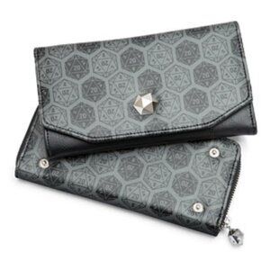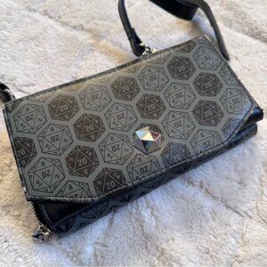 Details: Dungeons and Dragons, Convertible Wallet-Purse of Holding. Credit card and money holder. Zipper compartments. Flaws on corners. Vegan leather. Allover d20 of holding.