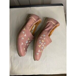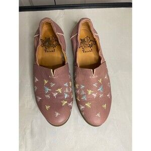 Think! Pink leather slip on loafers with embroidered bee design