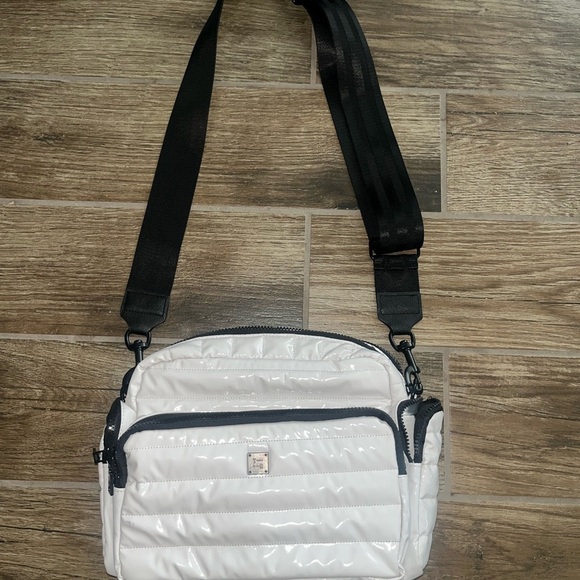 Stylish and versatile white crossbody bag with black accents. Perfect for everyday use. Lots of compartments and pockets
