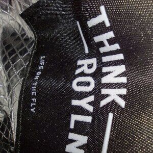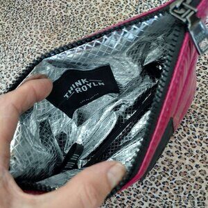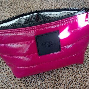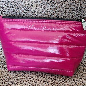 Think Royln Organizational Travel Pouch/Cosmetic Bag in Glossy Fuchsia color. Quilting exterior is lined with silver foil finish. Dimensions: