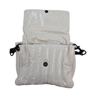 Adorable shiny white puffer hand bag that has a black bar handle with branded hardware. Three compartments on the inside, one being a zip closure compartment and several slip pockets. Shiny silver interior. One back pocket and flap snap closure.