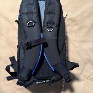 Also on the exterior front of the pack are two zippered front pockets. The upper one has an organizer panel for smaller items such as pens, batteries, memory cards, and a cell phone. Dual zippered pockets on either side of the pack have matching stretch pockets for storing a water bottle, gloves, or other gear. On top of the pack is an ID card holder and a padded grip handle. For added security, the YKK zipper pulls can accept a user-supplied, optional padlock.