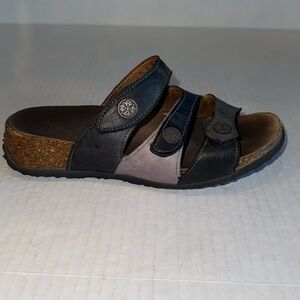 Think! Tri color leather slide sandals. Cork with a non slip sole. Velcro adjustable strap closures. Size 38 = US 7 1/2. Heel and ball of sole shows some wear, otherwise, good pre owned condition