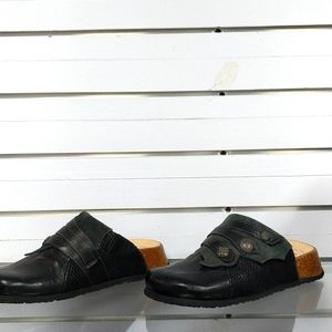 Black leather clogs with antiqued silver accents.