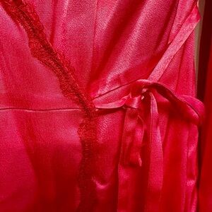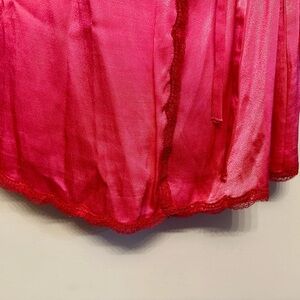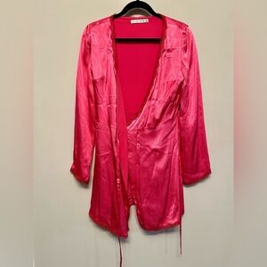 Bring some effortless luxury into your wardrobe with this Third Form wrap dress in a striking hot pink satin finish. This robe-inspired mini features a flattering wrap tie waist, V-neckline, and delicate lace trim for just the right touch of romance.