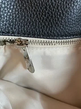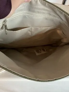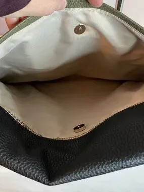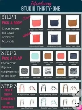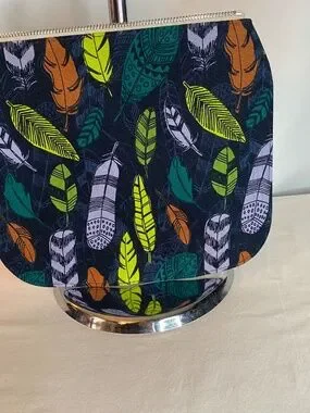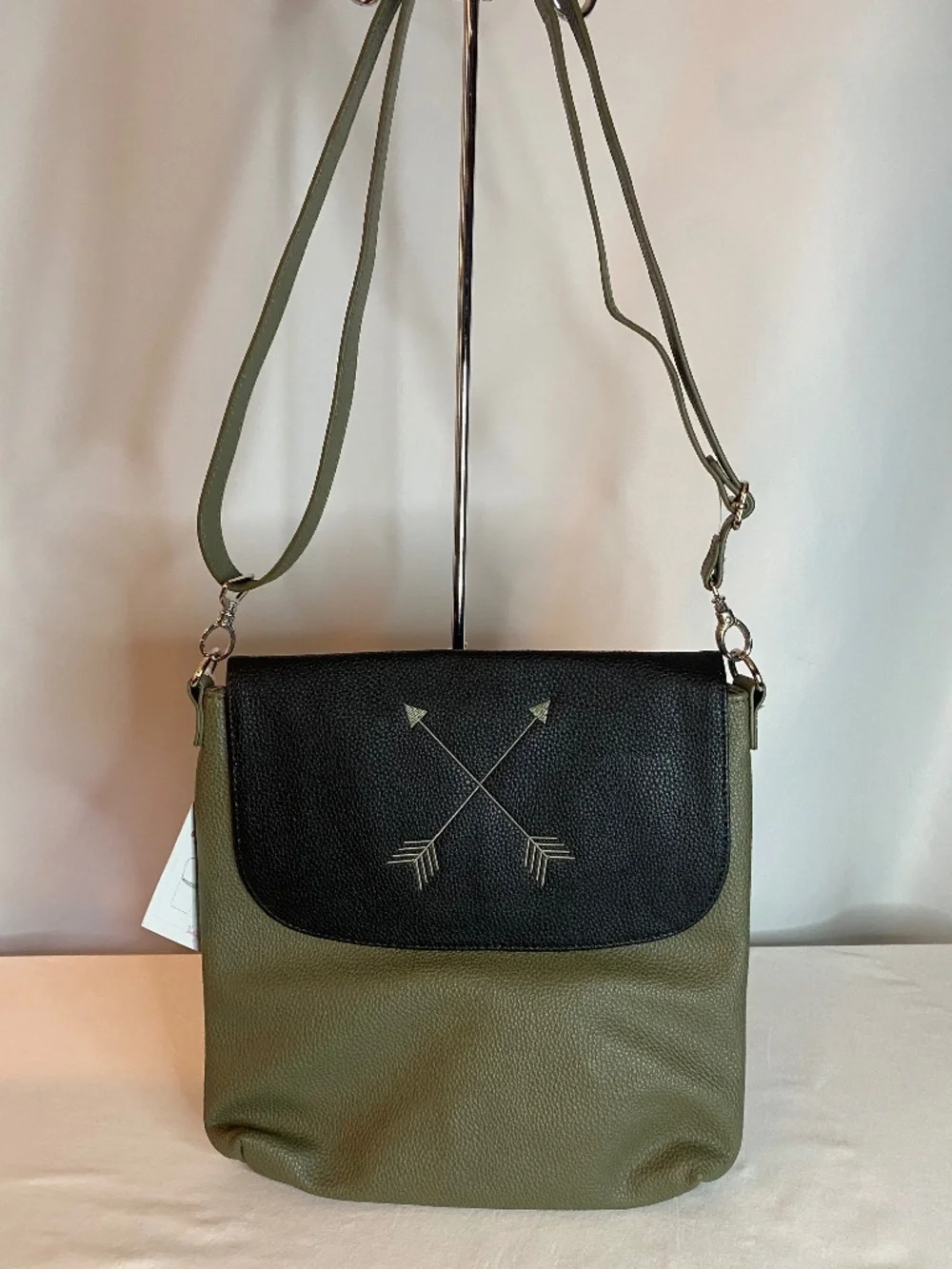 Shoulder/Crossbody bag by Thirty One. This one is "Modern" from the Studio collection. Front cover is interchangeable, this one comes with 2. Large pocket on back w/ a snap closure. Inside has a zipper pocket w/ 2 smaller open pockets. Silky lining. Shoulder strap is adjustable. Bag is olive green w/ a black cover. Embroidered arrows are in olive green. The 2nd cover is "Falling Feathers". Bag size 12.25x12.75