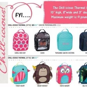 **THINK CHRISTMAS** New - never used. Super cute lunch thermal. Exterior outside pocket. Top handle. Inside is silver thermal lining. 10H x 8W x 3D. *THIS LISTING IS FOR THE Hoo's Hungry PRINT - NO EMBROIDERY. OTHER PRINTS SHOWN ARE FOR DESCRIPTION AND MEASUREMENTS