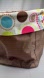 A versatile storage bin tote bag from Thirty One featuring a classic brown exterior with a vibrant polka dot accent lining. This bin is designed for organization and can be used in various settings.