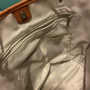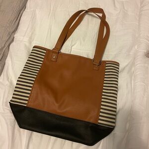 Thirty-one's Colorblock Tote in Caramel with Twill Stripe and Black. Structured style with sophisticated colorblocked cotton side panels makes this faux leather tote the perfect mix of chic and compact. Designed to function as an everyday purse, work tote, or weekend bag, this perfectly sized style can fit your tablet, notebook, wallet and other necessities.