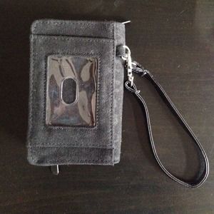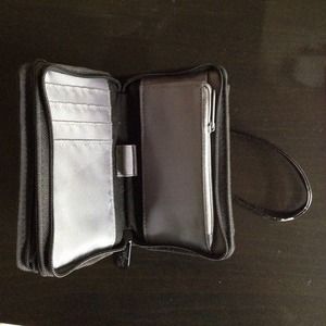 My favorite accessory for going out downtown. Carries my car key, phone and lip gloss inside! Never been used (brand new). Exterior ID Window; 4 card slots plus interior zipper coin pocket. Interior elastic loop. Front zippered compartment. Comes with detachable Wristlet strap. Black matte w/ black shine leopard print. Super cute.