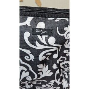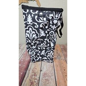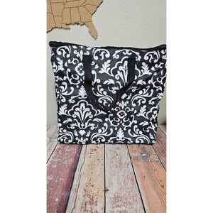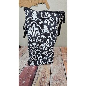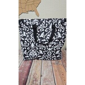 This Thirty-One tote bag is perfect for any occasion, whether you're traveling or just running errands. The black and white paisley pattern adds a touch of elegance to the bag, while the zip closure keeps your belongings secure. The bag features a large compartment with a white lining, perfect for storing all your beach essentials. The bag also comes with a folding feature, making it easy to store in your car or under your seat. The nylon handle/strap material is durable and comfortable to carry, while the black color adds a touch of sophistication. The bag is accented with a zipper and has a beach theme, making it the perfect addition to your summer wardrobe.