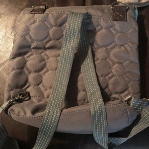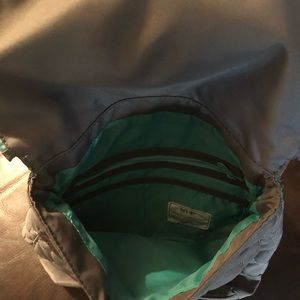 Gray and turquoise bag with inside zipper pockets and adjustable backpack straps; Great condition