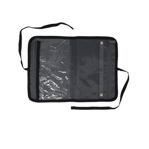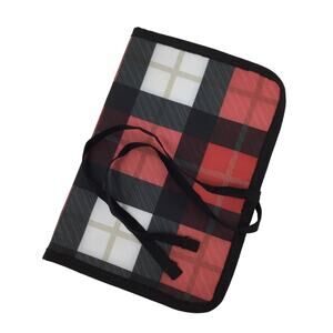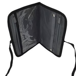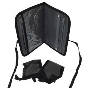 Features: two smaller bags for jewelry travel, two interior zippered pockets, snap feature to hold earrings (three sets of holes) and a tie top