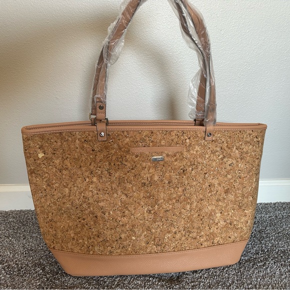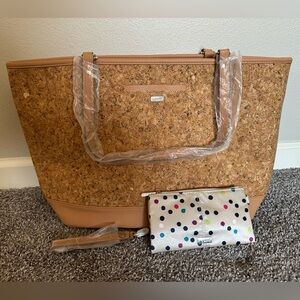 This tote has a reinforced bottom which helps it stand upright and hold its shape. It has long double handles for comfortable carrying. It also has multiple pockets for storage. This tote has two interior pockets, an exterior pocket, and a coordinating wristlet.
