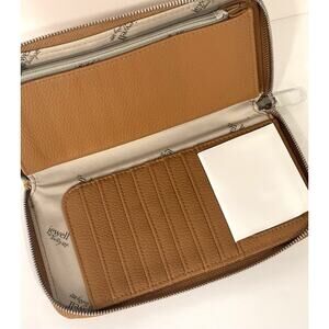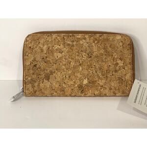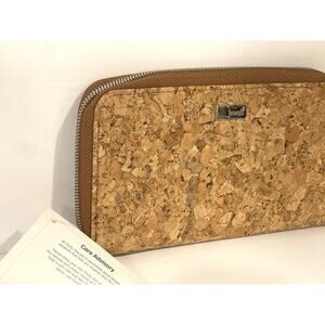 The Thirty-One Tan Metallic Cork Style Jewel All about the Benjamins Wallet is a stylish and practical accessory for women. Made of faux cork fabric in a solid brown color, this zip-around wallet features a metallic theme with designer accents. With credit card slots and a spacious interior, this wallet is both fashionable and functional for everyday use.