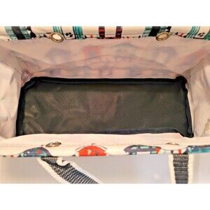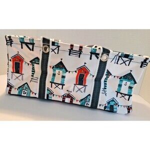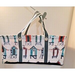 The Thirty-One mini utility tote in the Seaside Suites design is a stylish and practical tote or decor item for any beach adventure. Whether toting condiments, beach toys or baked goods to a seaside picnic or filling with shells or foliage in a cozy beach bungalow, this sporty tote will definitely be an eye catching accessory!. This adorable beach bungalow themed mini tote features a blue handle/strap and a multicolor exterior with a white lining, perfect for a beach or nautical-themed outfit or locale. Made from canvas, this tote is durable and lightweight, making it an ideal accessory for any seaside exploit. The Thirty-One brand is known for its quality products, and this utility tote is no exception, offering both style and functionality in one chic package.
