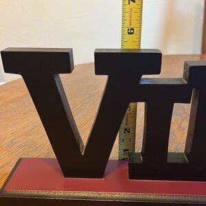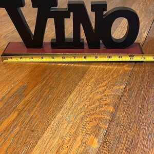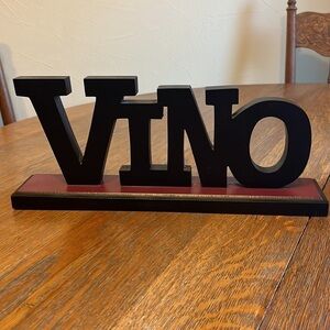 VINO is a black wooden sign on a base that has a burgundy color base
