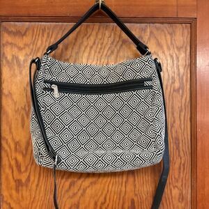 There is a handle on the outside, it is a 5 inch drop, and also a crossbody, the crossbody is a 20 inch drop.