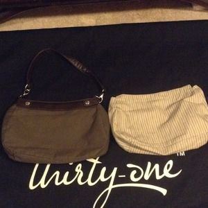 Brown suite skirt purse with taupe wave skirt. Can be taken off as shown and replaced with new skirt. Buy together price is:$ 50 just the brown base purse::$30 just the skirt:$15 comes with strap in brown. 2 interior flat pockets, and 1 interior zipper pocket. Zip closure and detachable strap. Easy to take off skirt and very. Never used comes in original plastic bag from Thirty one