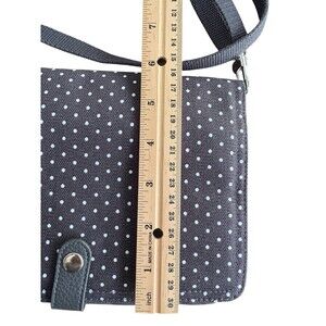 The Thirty-One 31 Double Up Crossbody Purse in Charcoal Gray Swiss Dot is a stylish and functional crossbody bag perfect for travel and casual occasions. With a rectangular shape and a small size, this purse features a zip and snap closure, a clear ID slot, credit card slots, and a variety of pockets for organization. Made from 100% cotton with a polyester and nylon lining, this purse is lightweight and easy to carry with its adjustable crossbody strap. The silver hardware and polka dot pattern add a touch of charm to this chic and practical accessory from the Thirty-One brand.