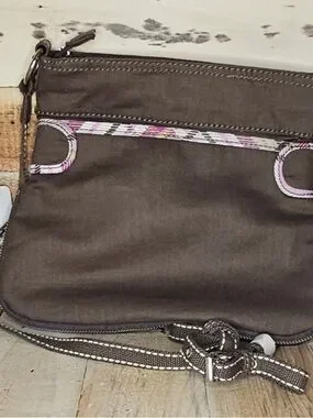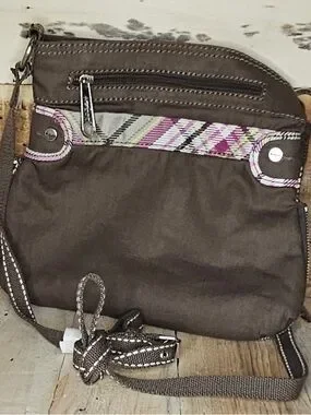 Stylish brown crossbody bag with pink plaid accent. Lightweight design for everyday use. Exterior zip pocket for easy access. Adjustable strap for comfortable wear. Neutral brown pairs well with casual outfits.