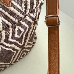 Crossbody bag by Thirty-One. Has long adjustable strap that can be removed. Has short handles and outer pockets on each side of bag. Inside has one pocket with zipper closure. The bag itself does not have a closure. Material is 100% cotton in woven geometric design. In very good condition.