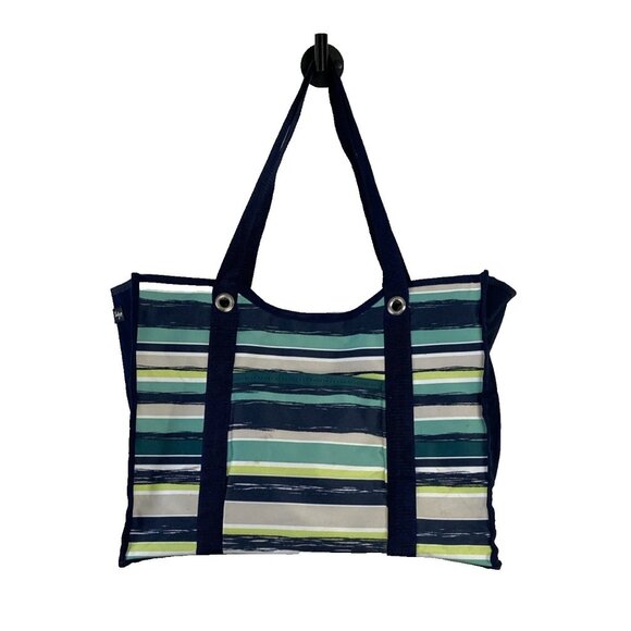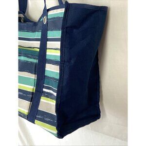 Thirty-One Deluxe Utility Tote Sea stripe Navy Blue Green White Beige Stripes