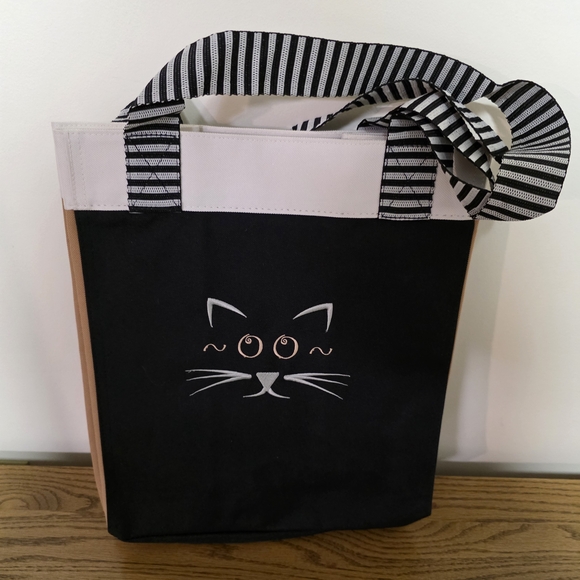 Charming tote with a playful cat face. Features black and white striped handles. Perfect for daily use.