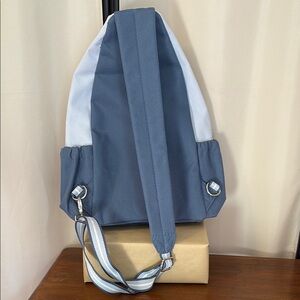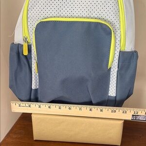 Stylish backpack featuring gray and white design. Bright yellow accents add a pop of color. Perfect for everyday use. Excellent used condition. Some small scuff marks.