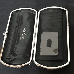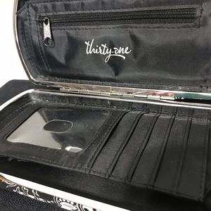 Black and white Thirty-One hard-sided clasp wallet. It measures 7 1/2" x 3 1/2" x 1". Excellent condition.
