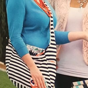 Like New without packaging. Thirty-One Inside Out Bag in Black Floral Brushstrokes. Reversible bag. (Both sides shown in pictures above.) 2 exterior flat pockets, 2 interior flat pockets and crossbody strap. Approx. Size: 12.5”H x 14”W x 6.5”D. (Picture of bag worn above in different print is just for a reference of how it can be worn.)
