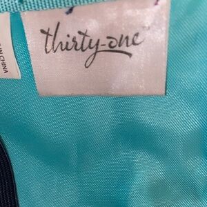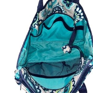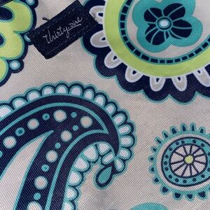 This Thirty-One lunch tote features a thermal interior lining in teal, construction of sturdy canvas material, and an adorable paisley patterned theme with variations of navy blue, teal, lime green, gray and white.