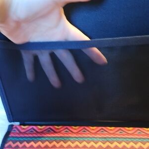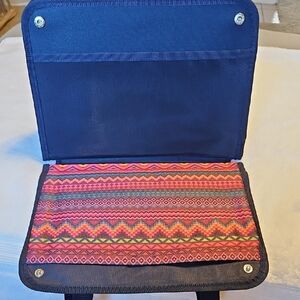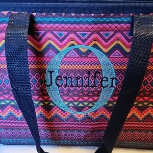 Has embroidery with name Jennifer and initial O. Fades right into design though. Has great zipper pockets and pouches in both snap closure pockets on outside. Big middle section that could hold a good amount of things. Durable handles. See pics... very unique but fun bag. NWT and never used. From a non-smoking/ pet free home.