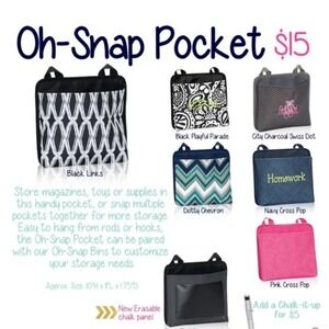 pockets together for more storage. Easy to hang from rods or hooks. The Oh-Snap Pocket is also great for the car.