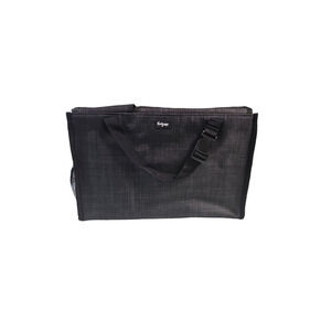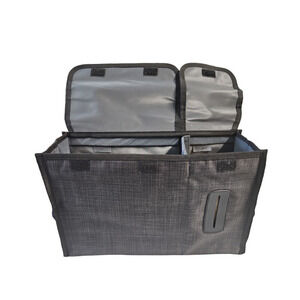 Create a convenient storage solution with compartments for diapers, trash bags, and laundry room essentials. The organizer measures approximately 9.5"H x 14.5"W x 4.5"D, featuring an easy pull-through slot for wipes, tissues, or other items. Use the strap to attach to your cars headrest.