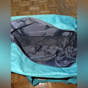Stylish teal duffel bag with gray accents. Perfect for travel or gym use. Approx. 11"H × 22"W x 12"D.