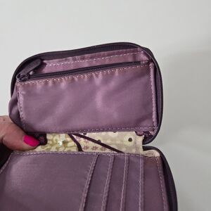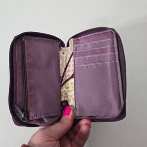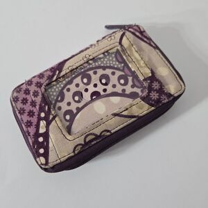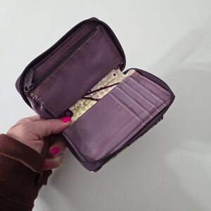 Stylish wallet with a unique pattern. Features a secure zipper closure. Compact and functional design.