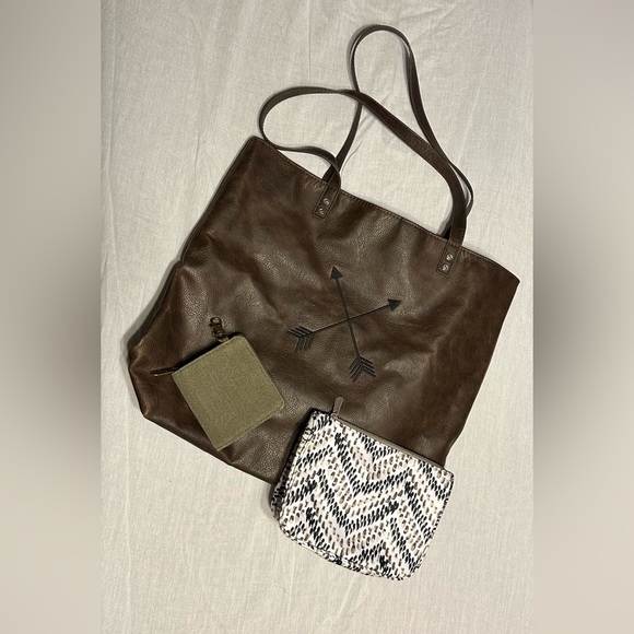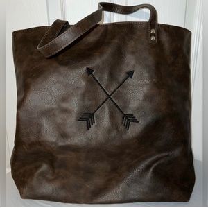 Thirty-One Around Town Tote with Black Arrow Embroidery approx 15”Hx13.75”L at bottom 17.25”L at top 6”D. Small phone pocket on back, two small pockets on inside, large zipper pocket behind two small pockets.