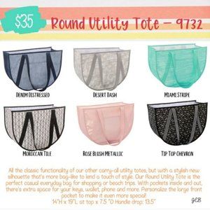 Thirty-One Round Utility Tote Denim distressed with smiley face embroidery icon