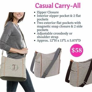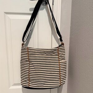Chic black and white striped tote. Features adjustable strap. Perfect for daily use.