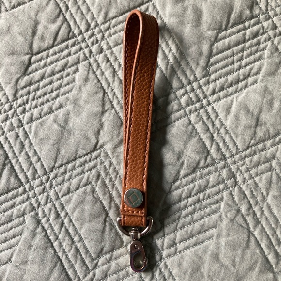 Stylish tan key holder. Durable leather strap. Secure metal clasp. EUC