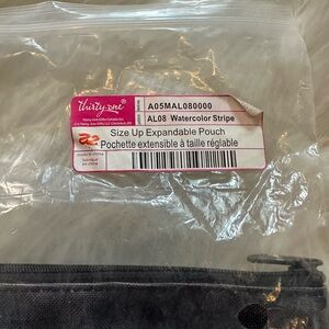 Expandable pouch with watercolor stripe design. Secure zipper closure.