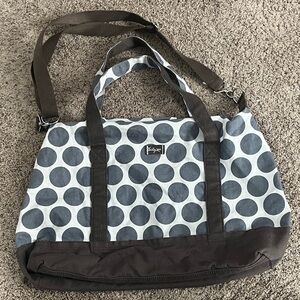 Stylish tote bag with a cute polka dot pattern. Features brown handles and base. One outside pocket, inside has one zippered pocket and two smaller pockets.