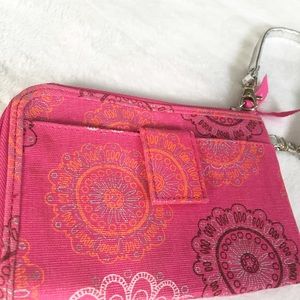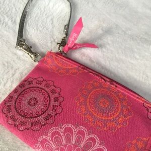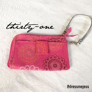 Gently used pink Thirty-One wallet Wristlet. Has inside slots for cards and a spot for ID. Barely visible stain on upper left corner shown in 2nd picture.