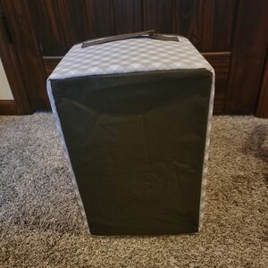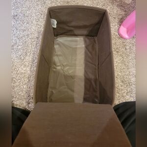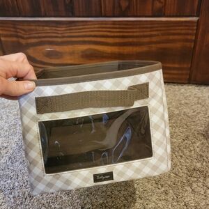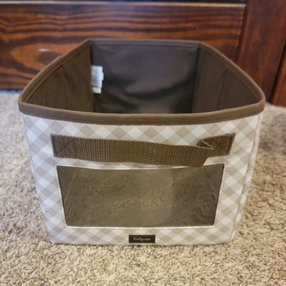 Thirty-one brand rectangular storage container with clear front. Great used condition. Some minor scuffs on the clear plastic window on 1 side. This is really clean and collapsible. Storage cube has a bottom that is stiff to help with stability. Great reusable and sturdy tote for organizing office, auto, closet, dorm, pantry, or study. 2 side handles. Taupe gingham pattern. Approximately 14x9x7 inches.