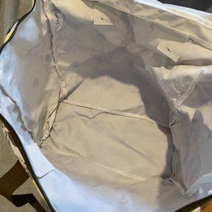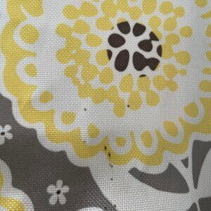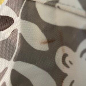 Can't remember the name of the product or print. It's in excellent condition. Great for storing items and folds down flat when not using. Small spot on side as pictured.