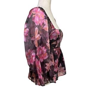 This Thirty/Thirty LA Women's puff sleeve babydoll blouse presents a romantic floral pattern set upon a deep plum background. The shimmery sheer floral bodice is fully lined underneath except for the semi-sheer sleeves.