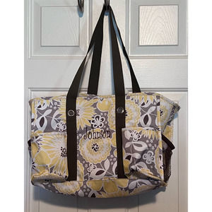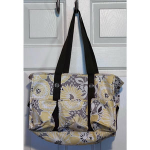 Thirty-one 31 Yellow Gray Floral Utility Tote/Bag 7 Pockets 2 Mesh on Sides